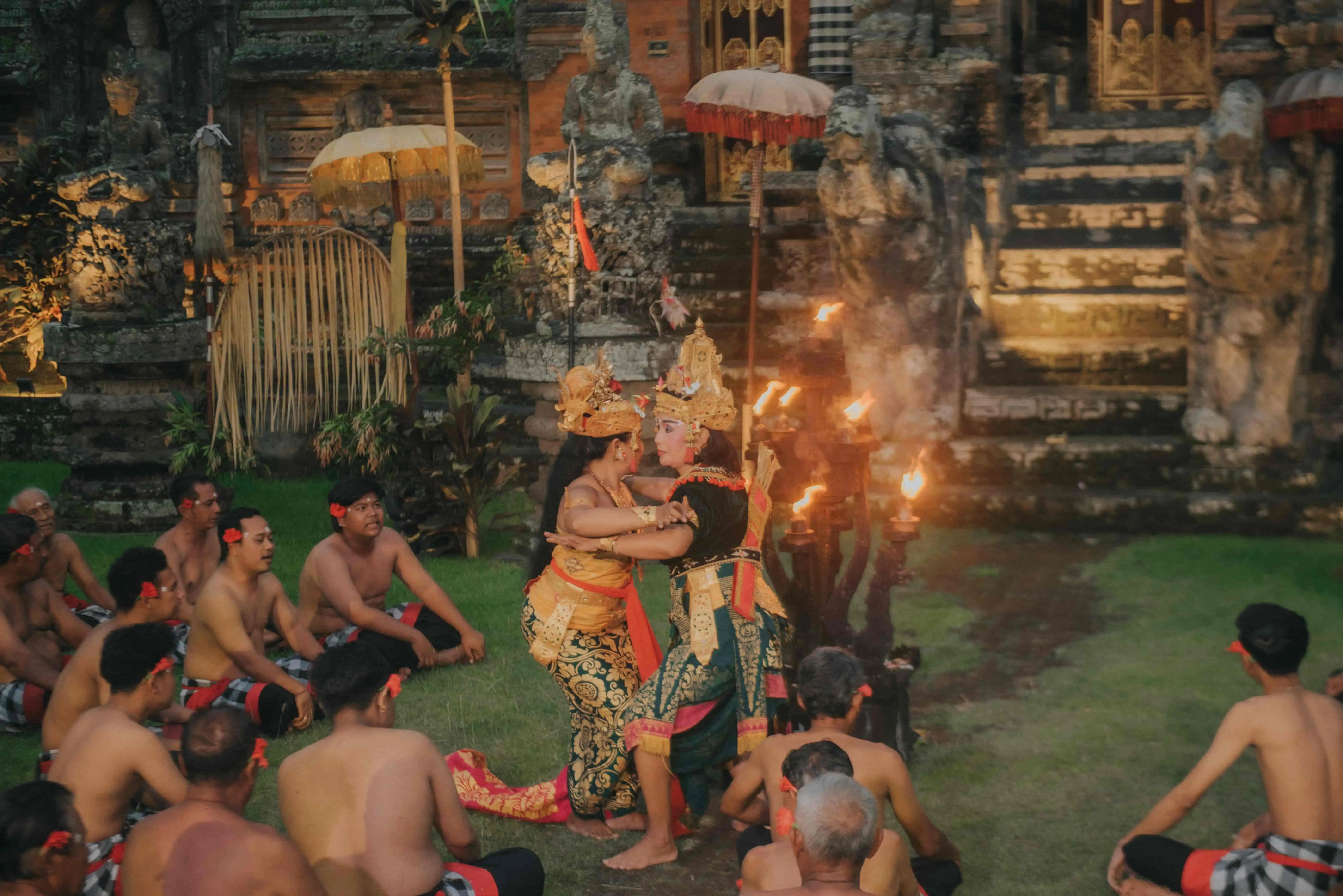 Instead, dozens of male dancers sit in a circle, creating rhythm entirely with their voices. The repeated “cak… cak… cak…” rises and falls in waves, forming a living soundscape that echoes through the temple courtyard.